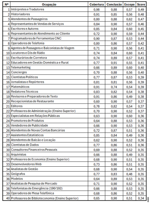 LISTA DAS 40 OCUPAÇÕES COM MAIOR APLICABILIDADE DE IA